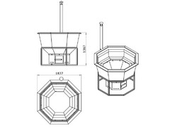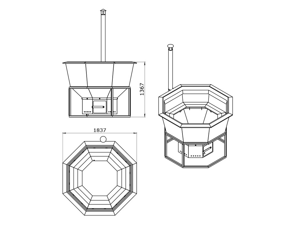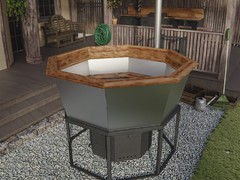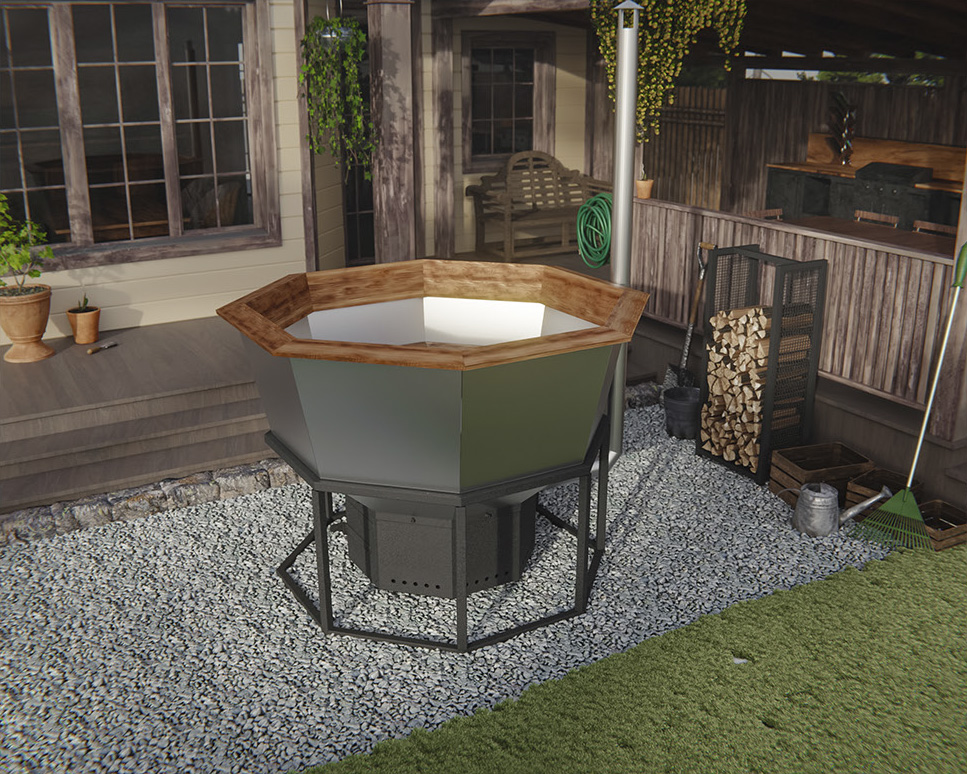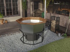 Чаша банной купели выполнена из прочных материалов, обеспечивающих длительный срок службы и надежность. Подогрев воды осуществляется с помощью открытого огня, разжигаемого дровами, что позволяет равномерно и эффективно нагревать воду. Такая конструкция сочетает в себе традиционные методы обогрева и современный комфорт, создавая естественную атмосферу тепла и уюта. Использование дров обеспечивает экологичность и натуральность процесса, а открытый огонь добавляет особый колорит и способствует расслаблению в процессе купания.